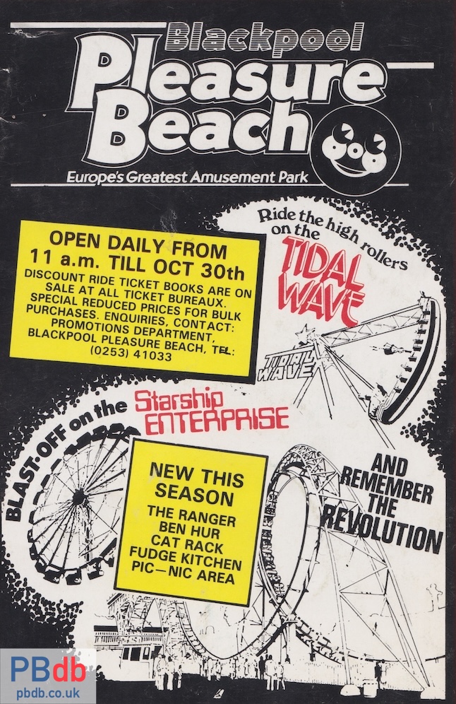 This poster for the 1983 season highlights the new features for the year. The headline new ride is the Ranger, replacing the Reel that had been dismantled over the winter months. The ‘swirl’ ride Ben Hur had also been introduced at the southern end of the site near where the Big One station stands today.