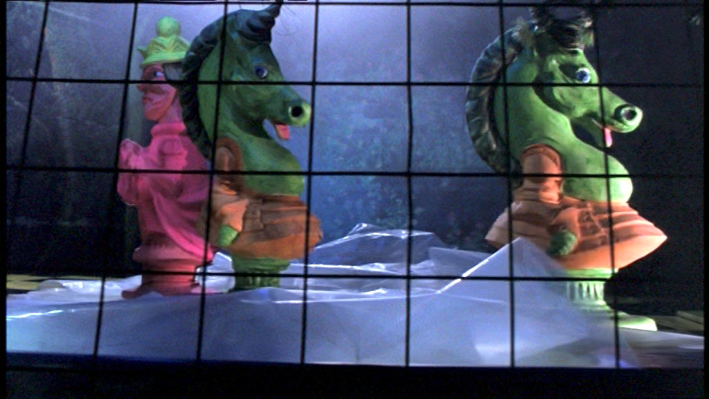 The action then moves to Alice in Wonderland where some coaster cars (presumably from the Grand National) are being stored in front of the ride.