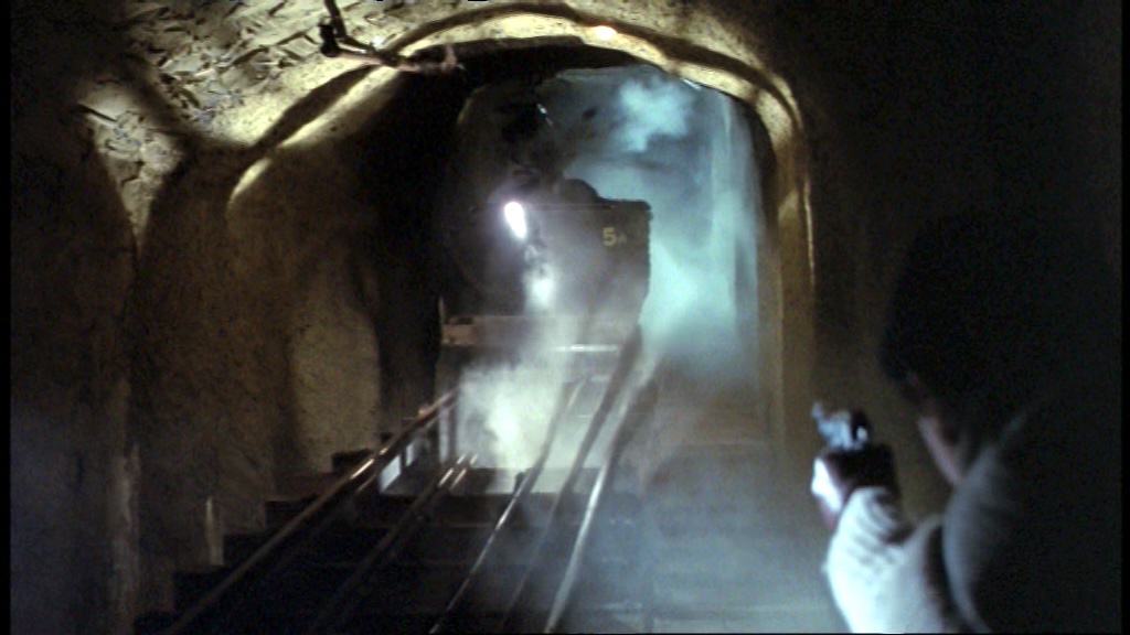 Mel Smith's character is seen maintaining the Cyclone, which still features its original colour scheme before the park's Moroccan theme would see it adopt a tan colour later in its existence.