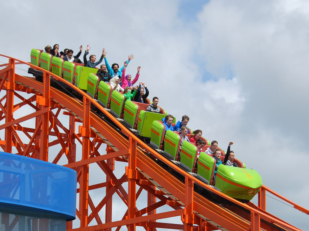 During construction, the ride was referred to in the press as the ‘New Velvet Coaster’, however upon opening it was known simply as ‘Roller Coaster’. The ride is a classic ‘out and back’ roller coaster, with the famed ‘aeroplane dip’ before the turnaround. The ride hugs the park boundaries, with Watson Road to the north and Bond Street to the east.